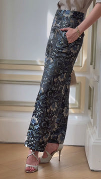 These straight-leg trousers are crafted from silk taffeta, offering a refined texture with a subtle, elegant structure. Designed with a high-rise waist to flatter the silhouette, the tailored cut enhances natural proportions while maintaining a polished appearance.