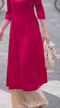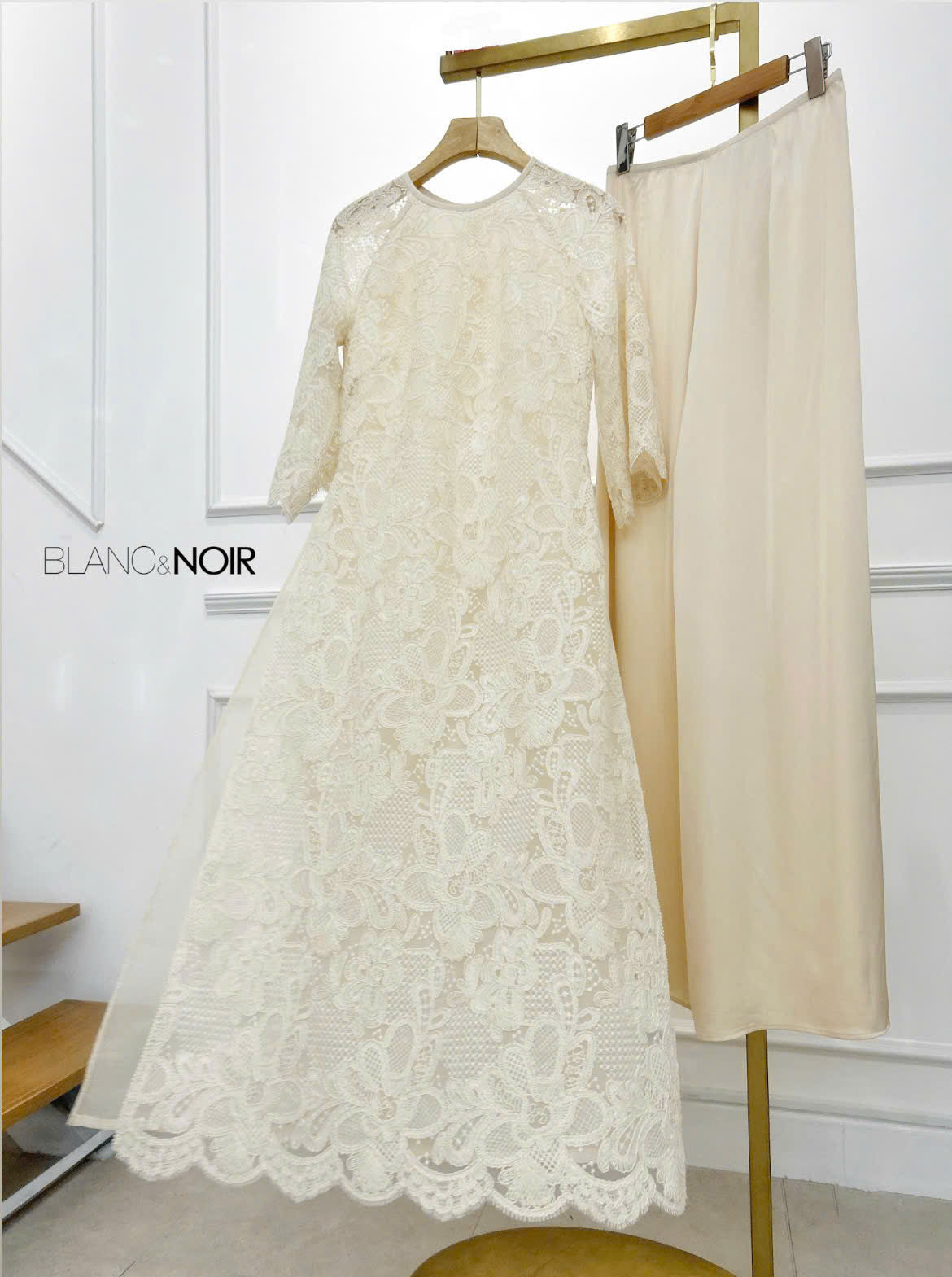 The beige satin trousers, in a soft and understated tone, enhance the overall elegance and create a perfect balance with the intricate embroidered lace — making them an ideal pairing for both the Thanh Xuân and Xuân Ca Ao Dai designs.