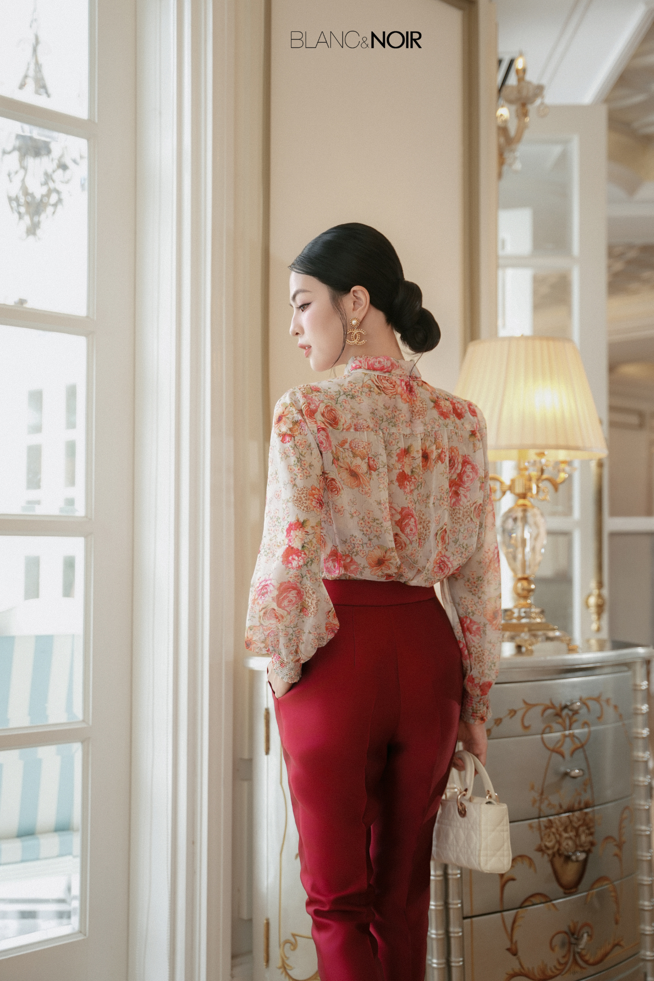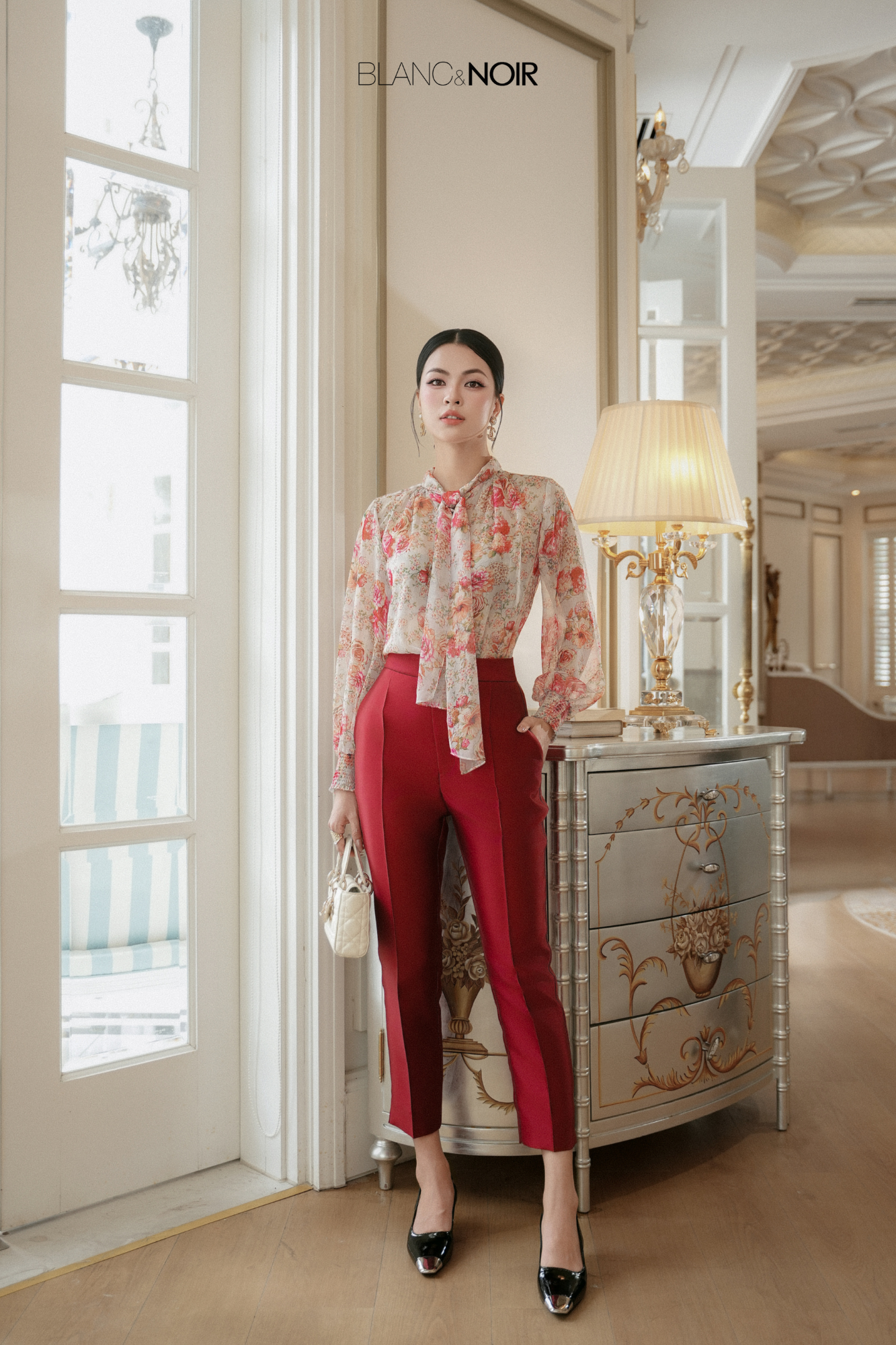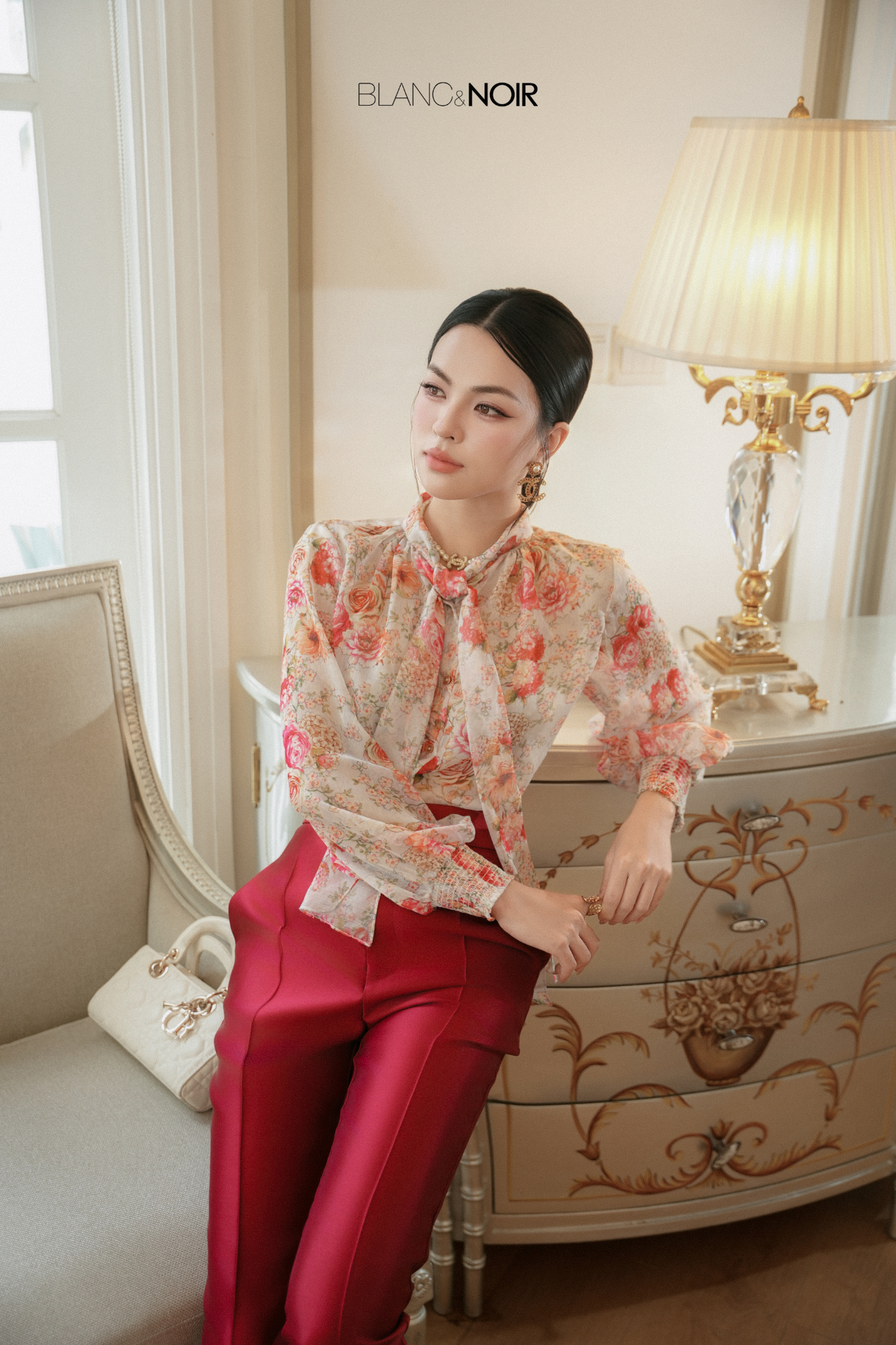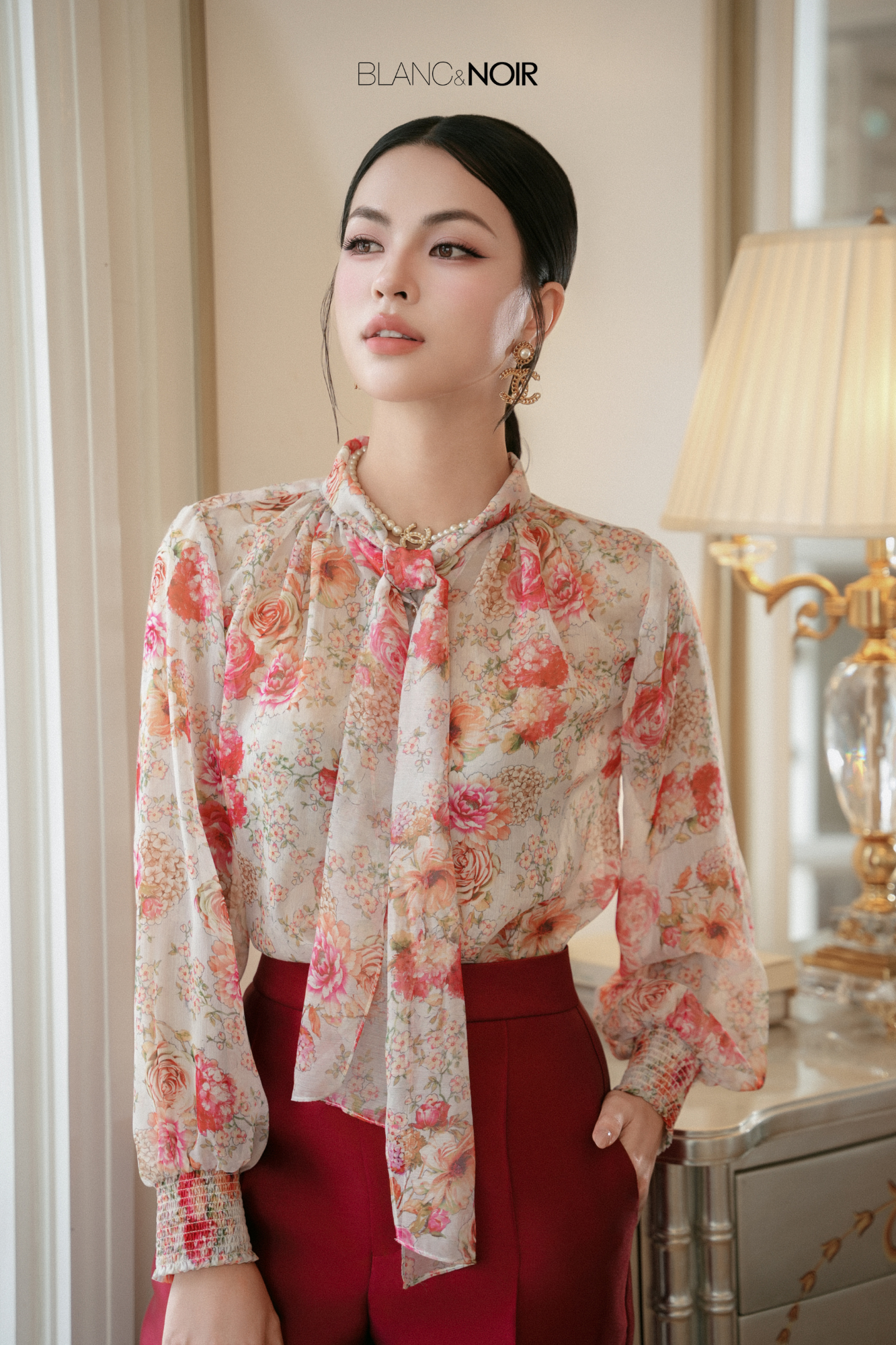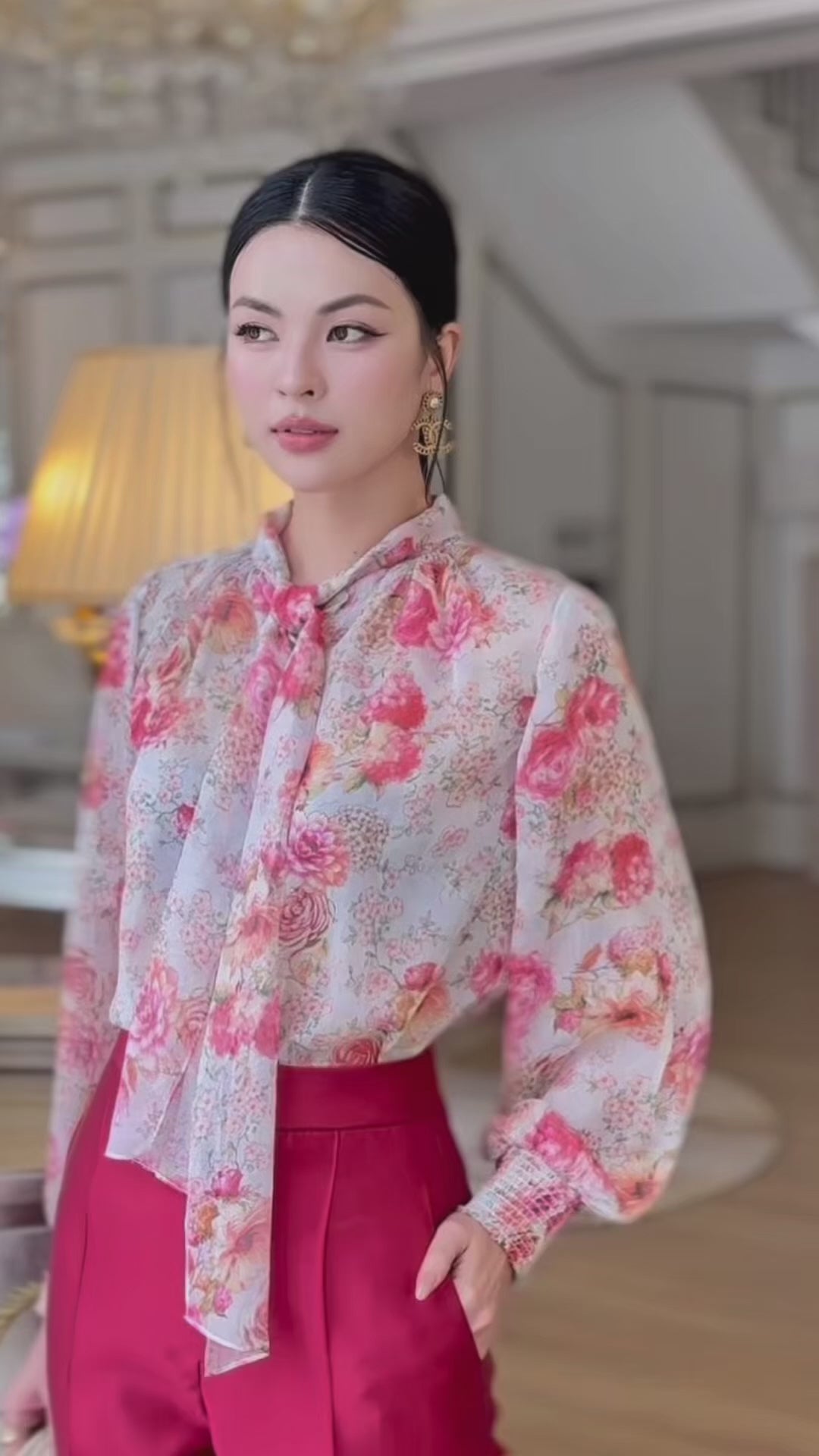 This chiffon blouse features a soft, fluid silhouette with a delicately gathered neckline that gracefully frames the neck. The adjustable neck tie can be styled loosely or tied into a bow, allowing for versatile expressions of personal style.